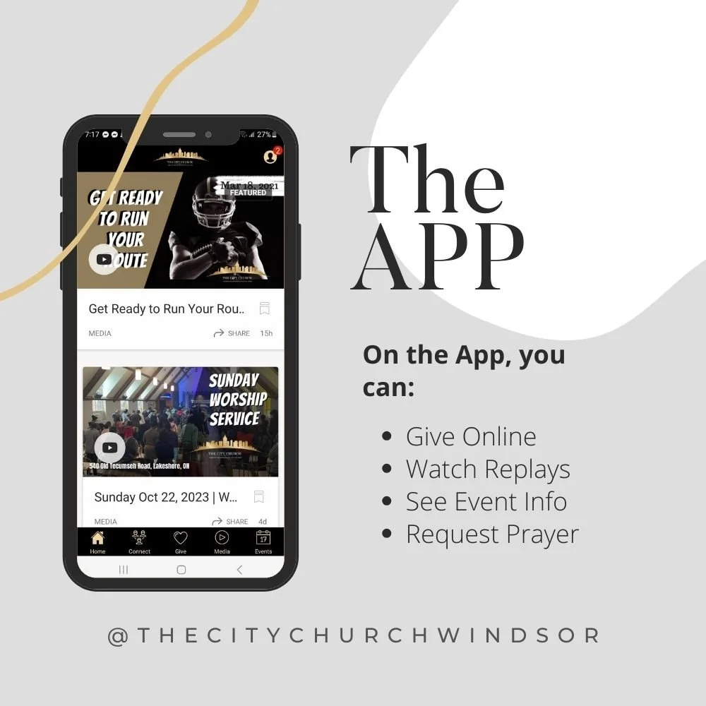 Download THE CITY CHURCH WINDSOR APP on Google Play store or the APP Store! Once it's downloaded, you can Give Online, Watch Replays, See Event Info, Request Prayer.